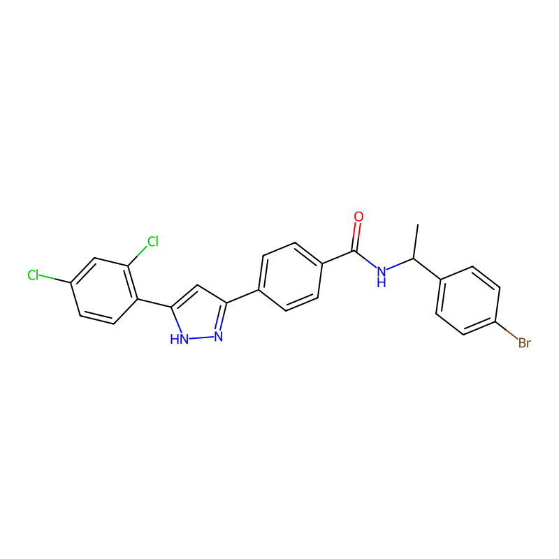 CC(C1=CC=C(C=C1)Br)NC(=O)C2=CC=C(C=C2)C3=NNC(=C3)C4=C(C=C(C=C4)Cl)Cl |