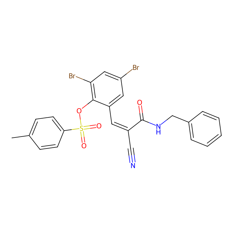 CC1=CC=C(C=C1)S(=O)(=O)OC2=C(C=C(C=C2Br)Br)C=C(C#N)C(=O)NCC3=CC=CC=C3 |