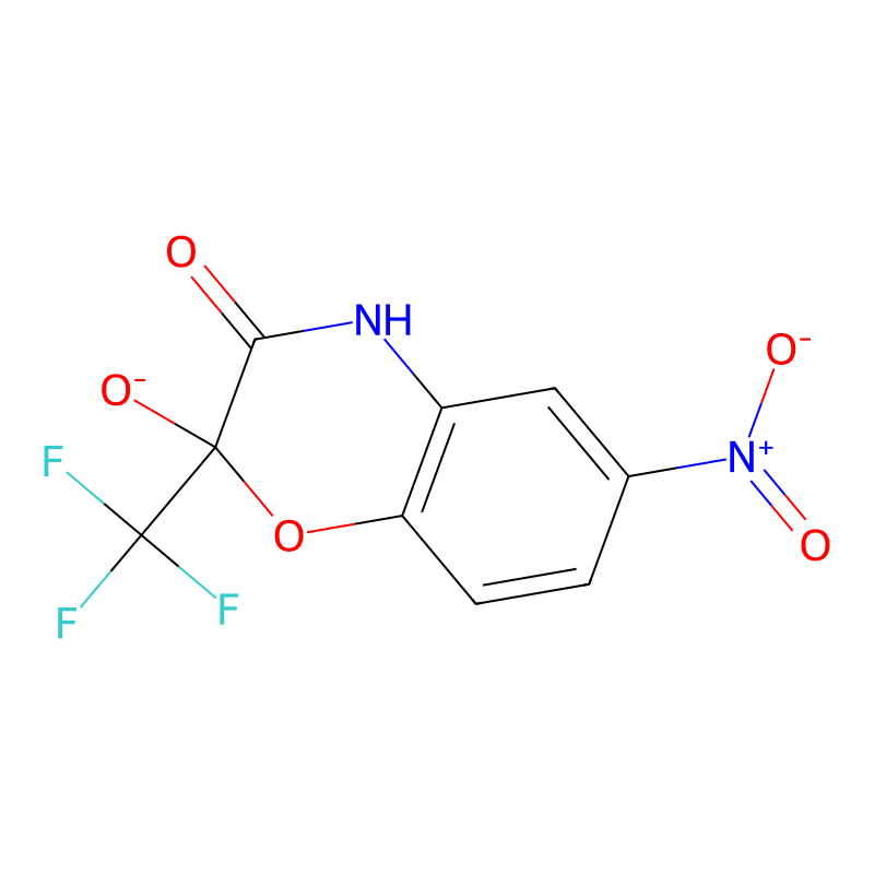 C1=CC2=C(C=C1[N+](=O)[O-])NC(=O)C(O2)(C(F)(F)F)[O-] |