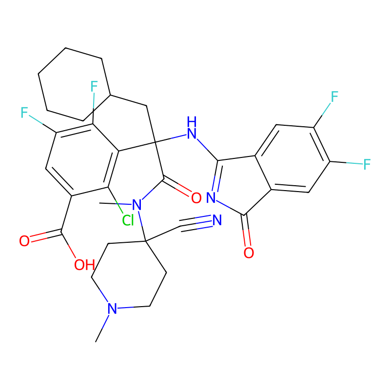 CN1CCC(CC1)(C#N)N(C)C(=O)C(CC2CCCCC2)(C3=C(C(=CC(=C3F)F)C(=O)O)Cl)NC4=NC(=O)C5=CC(=C(C=C54)F)F |