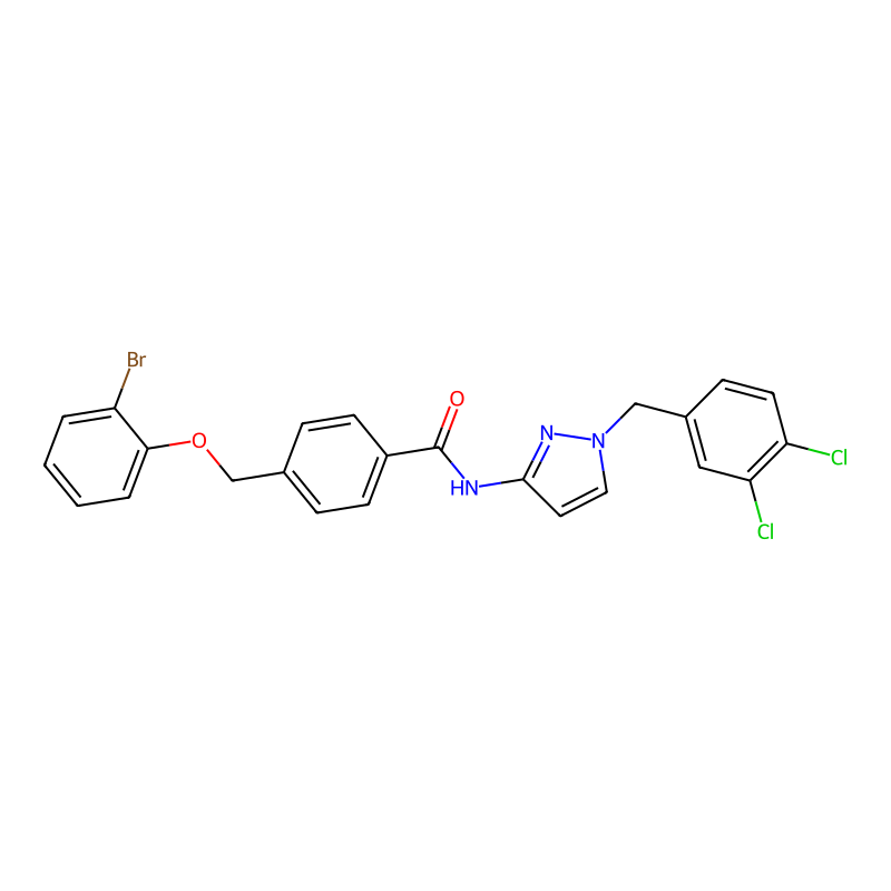 C1=CC=C(C(=C1)OCC2=CC=C(C=C2)C(=O)NC3=NN(C=C3)CC4=CC(=C(C=C4)Cl)Cl)Br |