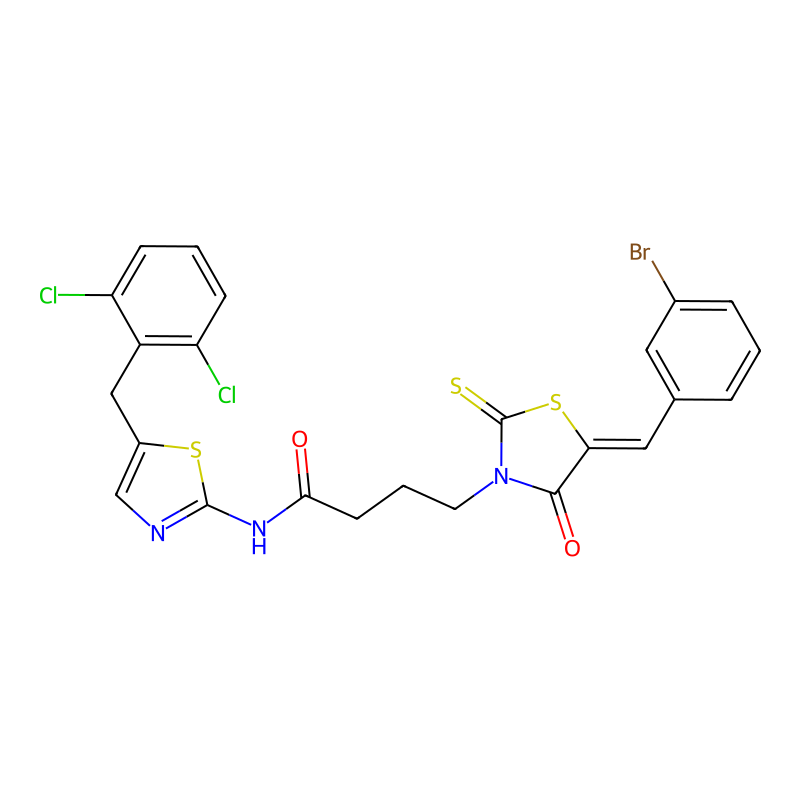 InChI=1S/C24H18BrCl2N3O2S3/c25-15-5-1-4-14(10-15)11-20-22(32)30(24(33)35-20)9-3-8-21(31)29-23-28-13-16(34-23)12-17-18(26)6-2-7-19(17)27/h1-2,4-7,10-11,13H,3,8-9,12H2,(H,28,29,31)/b20-11- |
