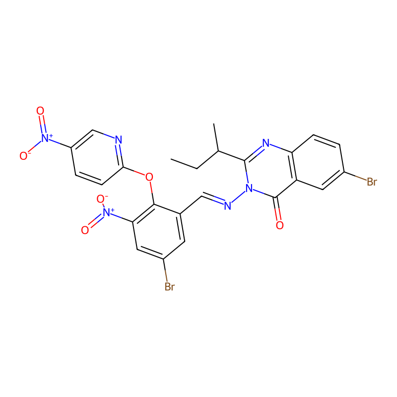 CCC(C)C1=NC2=C(C=C(C=C2)Br)C(=O)N1N=CC3=C(C(=CC(=C3)Br)[N+](=O)[O-])OC4=NC=C(C=C4)[N+](=O)[O-] |