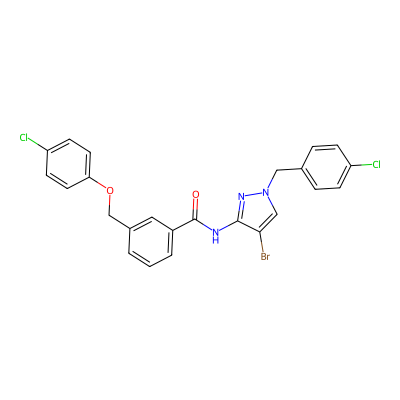 C1=CC(=CC(=C1)C(=O)NC2=NN(C=C2Br)CC3=CC=C(C=C3)Cl)COC4=CC=C(C=C4)Cl |