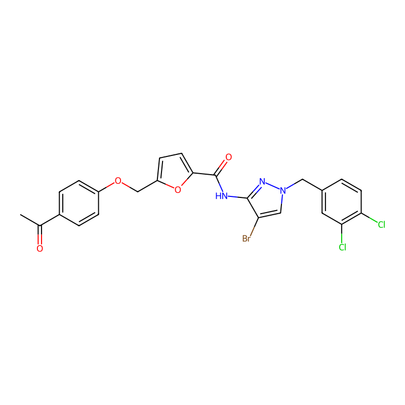 InChI=1S/C24H18BrCl2N3O4/c1-14(31)16-3-5-17(6-4-16)33-13-18-7-9-22(34-18)24(32)28-23-19(25)12-30(29-23)11-15-2-8-20(26)21(27)10-15/h2-10,12H,11,13H2,1H3,(H,28,29,32) |
