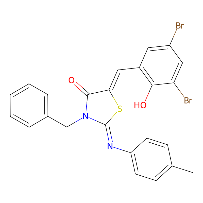 (5E)-3-苄基-5-[(3,5-二溴-2-羟基苯基)亚甲基]-2-(4-甲基苯基)亚氨基-1,3-噻唑啉-4-酮 (5E)-3-benzyl-5-[(3,5-dibromo-2-hydroxyphenyl)methylidene]-2-(4-methylphenyl)imino-1,3-thiazolidin-4-one |