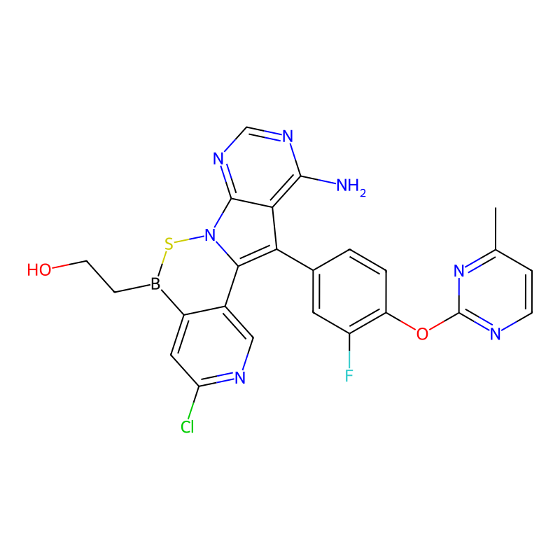 InChI=1S/C24H18BClFN7O2S/c1-12-4-6-29-24(33-12)36-17-3-2-13(8-16(17)27)19-20-22(28)31-11-32-23(20)34-21(19)14-10-30-18(26)9-15(14)25(37-34)5-7-35/h2-4,6,8-11,35H,5,7H2,1H3,(H2,28,31,32) |